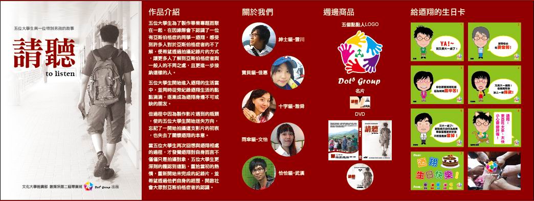 楊雲川、謝武漢、張雅舜、范文怡、方佳惠五位同學,中國文化大學數位媒體學士學位學程學士,目前在國內外工作,曾陪伴星奇兒兩年。 星兒(自閉症)黃迺翔就讀大學期間,學習經常遇到困境,難以融入團體,雲川、武漢、雅舜、文怡、佳惠五位同學,為了幫助迺翔,主動陪伴共讀,協助指導課學習,並決定以這過程拍成記錄片,創作實務專題作品「請聽To Listen」,透過影像,記錄五位大孩子與迺翔的交友、共學與互動。 共學期間,五位同學經常開會探討,了解一般孩子與自閉症的差別,透過各種嘗試,找出溝通與互動的方法。本作品記錄剪輯這年的迺翔日常生活與學習情況,成果偕同星奇兒藝術展,在臺北市政府、臺中市政府公開播映,感動很多人,並獲得客家電視台1395打戲路優選作品。